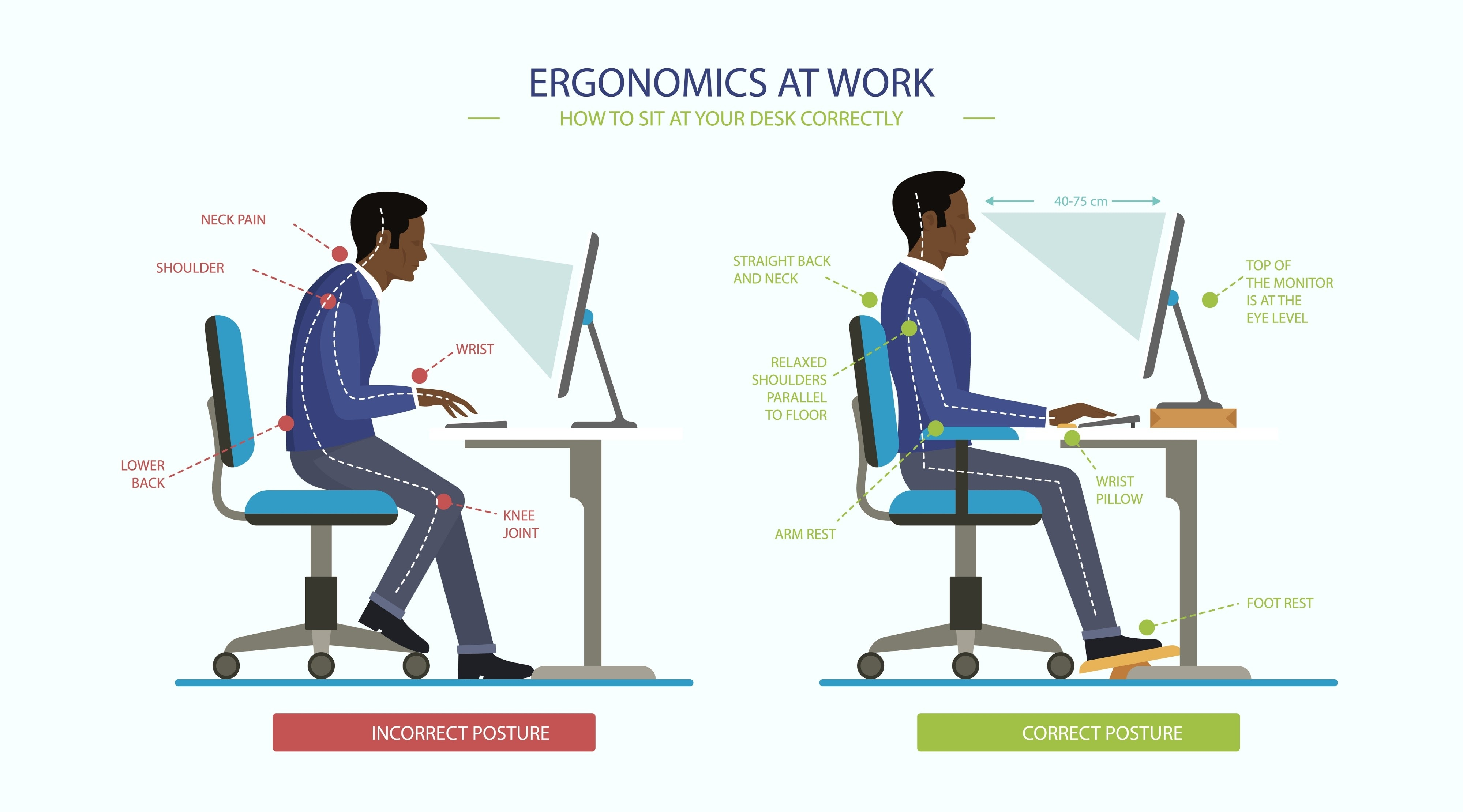 • Poor Posture & Ergonomics: Slouched seating, unsupported wrists, screens positioned too high or low